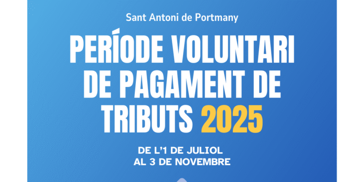 El Ayuntamiento de Sant Antoni inicia mañana el plazo para el pago voluntario de los recibos de los diferentes tributos municipales para el ejercicio 2025. El periodo empieza este marte 1 de julio y finalizará el 3 de noviembre.