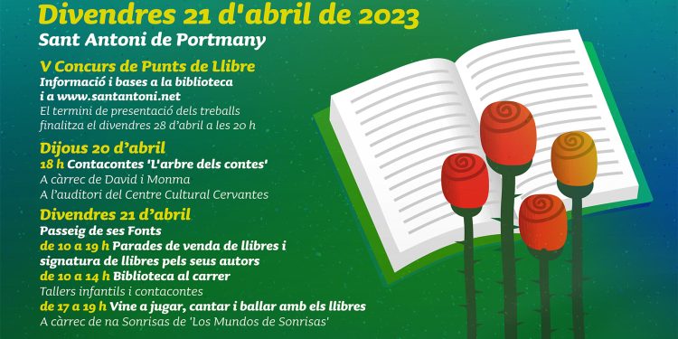 La concejalía de Cultura del Ayuntamiento de Sant Antoni ha organizado un programa de actividades para celebrar esta semana el Día de Sant Jordi. Con motivo del Día Internacional del Libro (23 de abril) y del Día Internacional del Libro Infantil y Juvenil (2 de abril), el viernes 21 de abril se instalarán en el Passeig de ses Fonts, de 10 a 19 horas, diferentes puestos de venta de libros, a la vez que habrá firma de ejemplaresde siete autores: