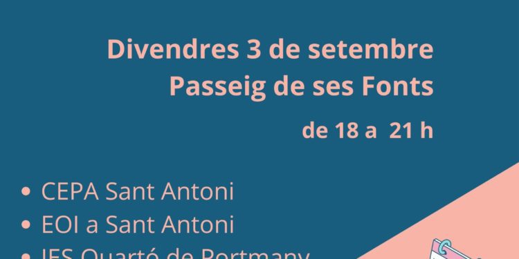 El Ayuntamiento de Sant Antoni ha organizado la primera Mostra d’Oferta Formativa, que se celebrará este viernes 3 de septiembre en el Passeig de ses Fonts con la participación del CEPA Sant Antoni, la Escuela Oficial de Idiomas (EOI), los institutos del municipio Quartó de Portmany y Sa Serra y el Servei d’Ocupació de les Illes Balears (SOIB).