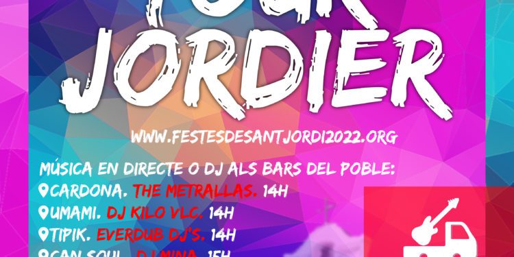 Començant pel més immediat, el VIII Tour Jordier convoca els més marxosos a gaudir de la bona música que han programat una desena de bars i restaurants de Sant Jordi a partir de migdia. Així, a la majoria de negocis del poble hi desfilaran bandes en viu i dj per animar l’hora de l’aperitiu i fins a la posta de sol amb consumicions a preus populars i amb molta animació també als carrers, per on circularà l’escenari mòbil on hi actuaran The Groovy Brothers i els Eivisurfers. El final de festa està programat a les 20 hores, quan el dj Sr. Cardona es posarà als plats instal·lats a la plaça de Sant Jordi.