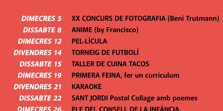 Les projeccions de les pel·lícules amb sofà i crispetes seguiran fent-se algunes de les tardes dels dimecres, el divendres 14 hi haurà un torneig de futbolí, el dissabte 15 un taller de cuina de tacos, el dimecres 19 un taller per ensenyar a fer un currículum i el divendres 21 tarda de karaoke.