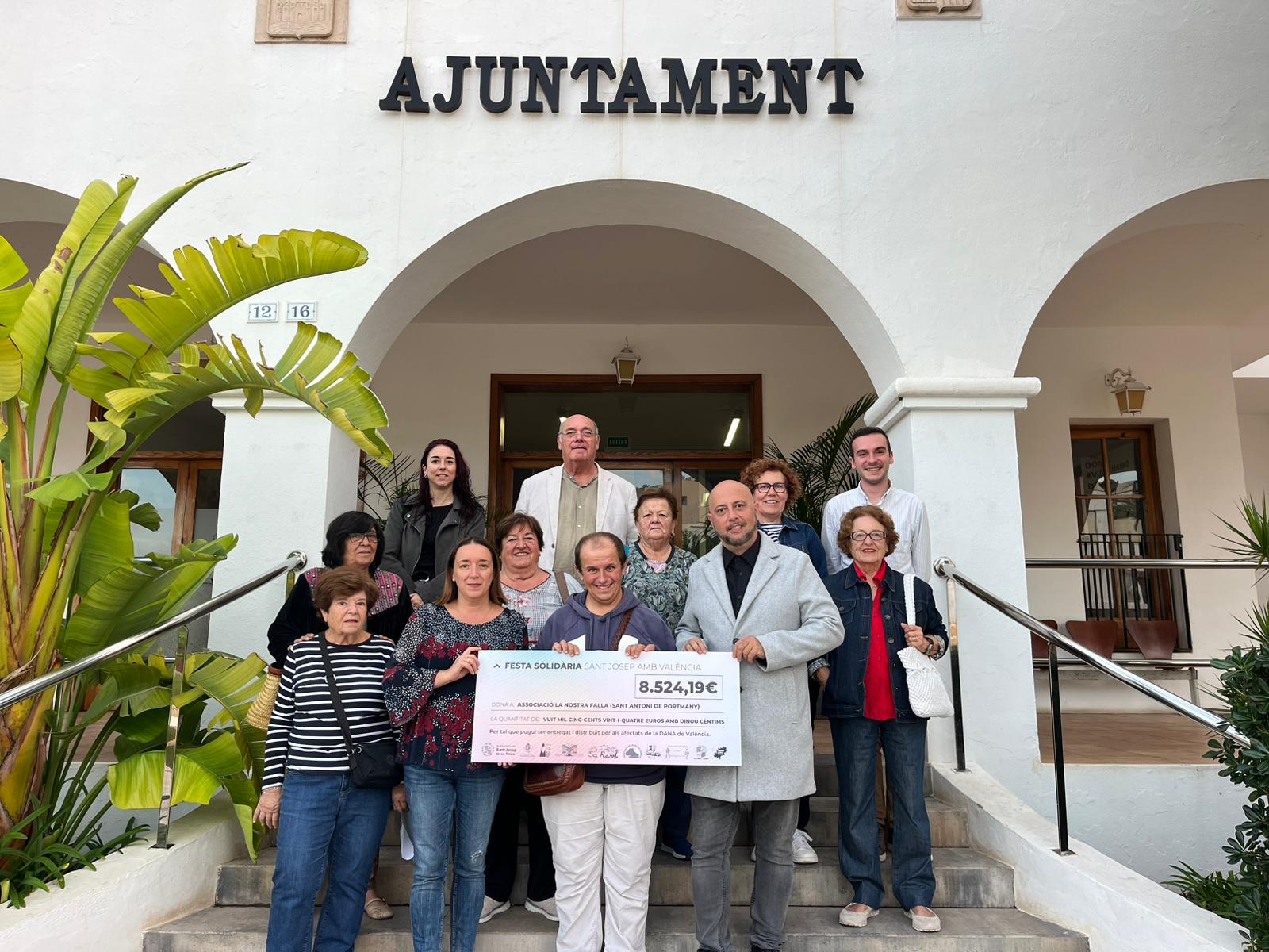 El Ayuntamiento de Sant Josep de sa Talaia acogió este miércoles el acto simbólico de entrega de un cheque por valor de 8.524,29 euros, destinado a ayudar a los afectados por la DANA que azotó la provincia de Valancia. El importe recaudado procede del festival solidario “Sant Josep amb València”, celebrado el pasado mes de marzo durante las fiestas patronales. El evento fue organizado por diversas asociaciones locales con la colaboración del Ayuntamiento de Sant Josep, que ha agradecido la implicación ciudadana y el espíritu solidario del municipio.
