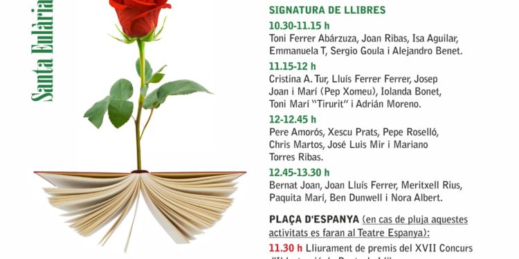 En total, habrá 17 puestos, en los que se incluyen cuatro librerías (Barco de Papel, Serreta, Bienestar Ibiza y Fa en quarta), tres editoriales (Balàfia Postals, Edicions Aïllades y la del Institut d’Estudis Eivissencs), seis autores, el Museu Etnogràfic d’Eivissa de Can Ros y la propia Biblioteca Municipal. Además, la floristería Clivia ofrecerá la posibilidad de comprar las tradicionales rosas, inseparables de la Diada de Sant Jordi. De forma excepcional, alumnos del CEIP Sant Ciriac ofrecerán libros de segunda mano y rosas de manualidades para conseguir fondos para su viaje de estudios.