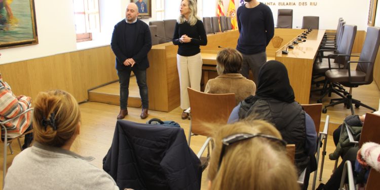La alcaldesa de Santa Eulària des Riu, Carmen Ferrer; el concejal de Promoción Económica, Miguel Tur; y el responsable de la oficina en Santa Eulària del Servei d’Ocupació de les Illes Balears (SOIB), Xavier Roselló, han participado este mediodía en el acto de despedida de las ocho personas que han realizado el curso del SOIB de Proyectos Territoriales para Colectivos vulnerables.