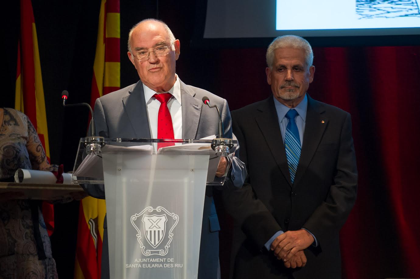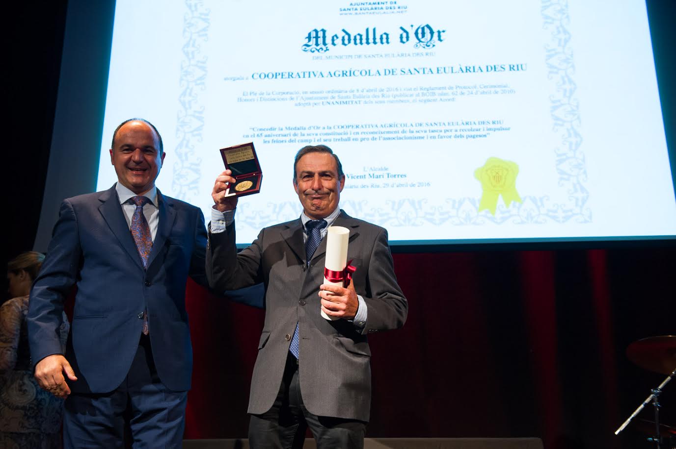 La sexta Medalla d’Or de Santa Eulària des Riu va estar entregada per l’alcalde, Vicent Marí, a l’actual president de la Cooperativa Agrícola de Santa Eulària des Riu, Josep Colomar. El guardó coincideix amb els 65 anys des de la fundació de l’entitat i vol reconèixer la seva funció d’impulsor d’aquesta activitat econòmica, encara tan important al municipi; però també “avui fem un homenatge a totes les persones que viuen i han viscut cuidant la terra, a totes les persones que segueixen la tradició dels seus avantpassats en un moment en que, lamentablement, ser pagès és quasi una excentricitat per la duresa de la feina i les dificultats que comporta”, com va resumir el primer edil. Abans de l’entrega, es va fer una petita introducció amb diferents imatges antigues del poble i algunes curiositats de l’any de fundació de la Cooperativa, 1951, com ara els bans que feu l’alcalde o com triomfava la cançó ‘Olé Torero’, una peça en francès cantada pel mexicà Luis Mariano.