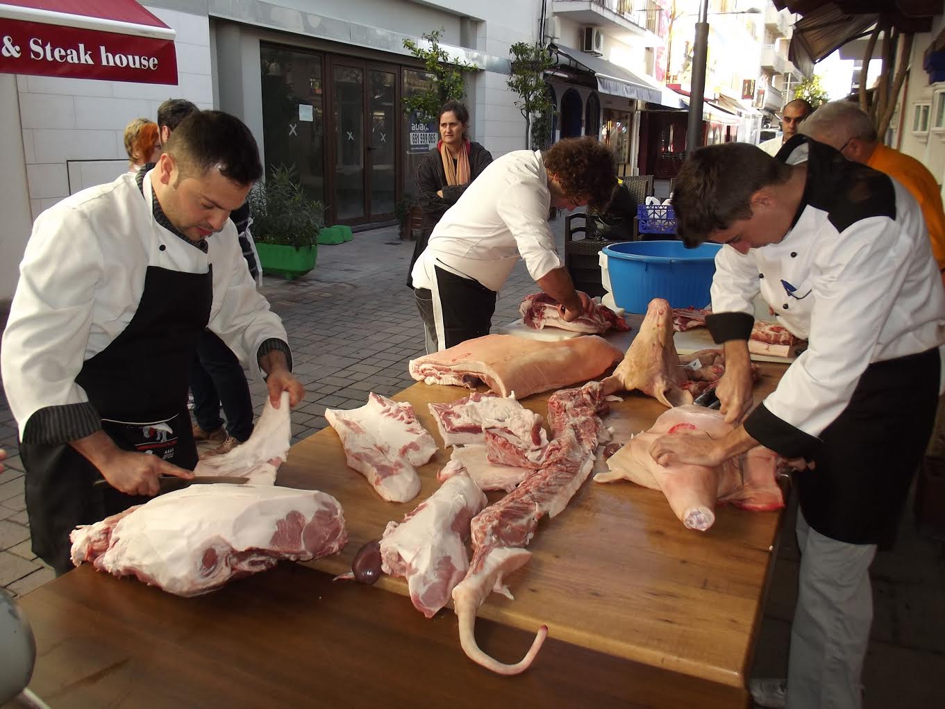 Per a demostrar el seu compromís amb la tradició i la qualitat habituals en la preparació d’aquestes delícies, aquest matí s’han fet unes ‘matances’ al carrer Sant Vicent, encara que per motius de salubritat el porc ha vingut ja mort de l’escorxador. Però al lloc s’ha desenvolupa tot el procés, des de l’esquarterament de l’animal fins a la seva preparació amb espècies i l’ompliment de les tripes per a preparar sobrassades i botifarrons.