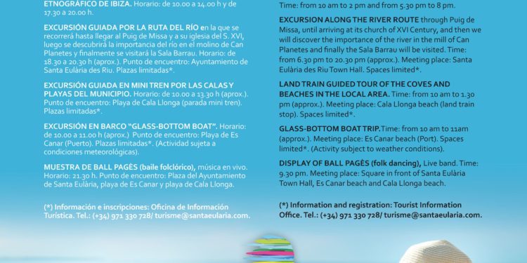 Por cuestiones de seguridad sanitaria y restricciones Covid-19, las plazas serán limitadas en todas las excursiones. Toda la información y el acceso a las inscripciones llamando al teléfono de la Oficina de Información Turística, el 971 330 728, o enviado un mail al turisme@santaeularia.com.