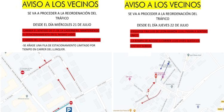 Los primeros cambios se empezarán a aplicar mañana miércoles, 21 de julio. La Calle Cardenera, situada en Jesús, cambiará de sentido y, por su parte, la Calle Llinquer, también situada en dicho núcleo, pasará a ser de sentido único hasta la Calle Canario.