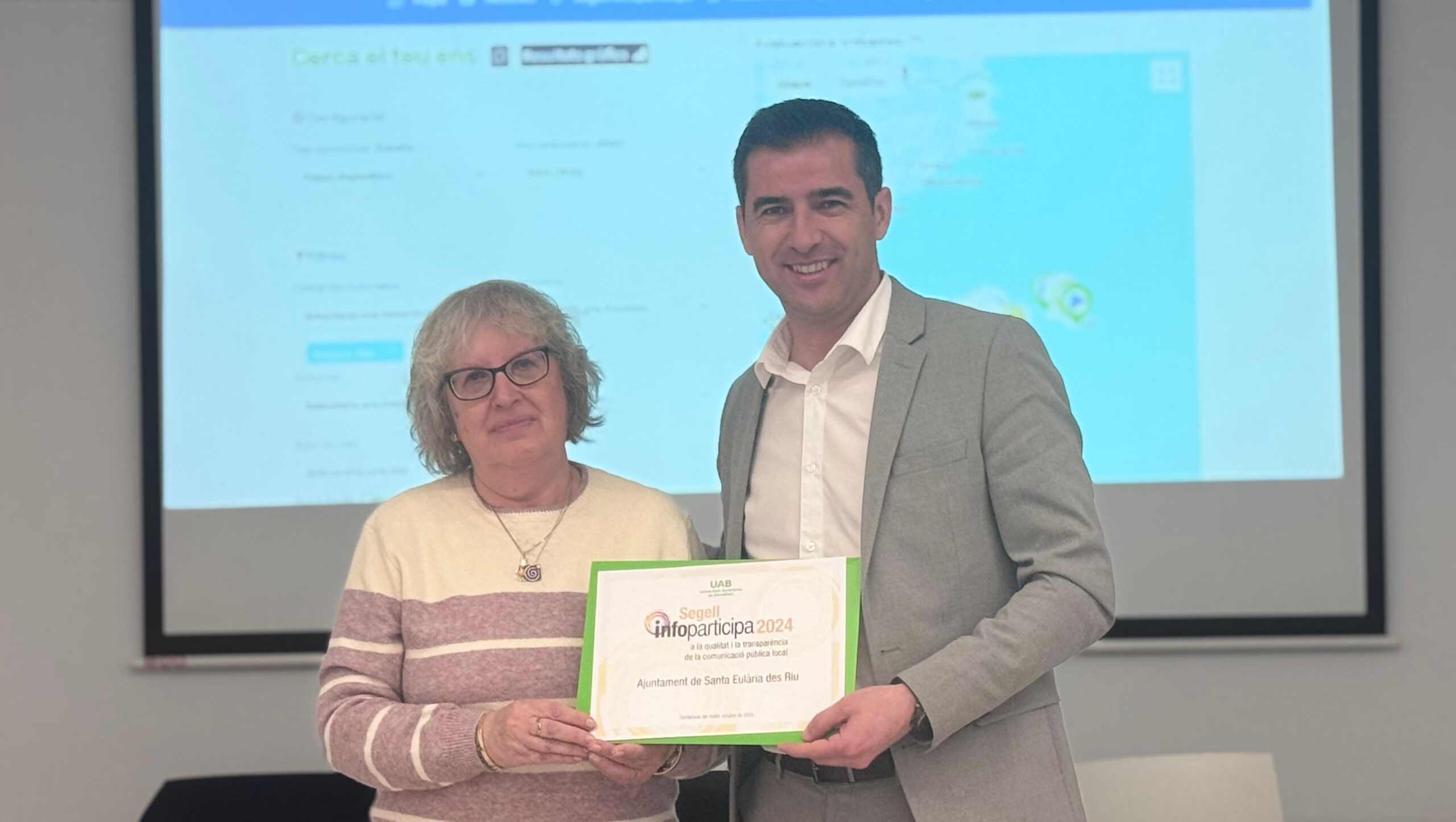 El Ayuntamiento de Santa Eulària ha recibido esta mañana en Inca el Sello Infoparticipa 2024, otorgado por la Universitat Autònoma de Barcelona (UAB), tras la evaluación llevada a cabo en el año 2025, que reconoce el nivel de transparencia y calidad de la información pública de las administraciones locales. El tercer teniente de alcalde del municipio, Toni Ramon, ha recogido el galardón en el acto celebrado en el Ajuntament d’Inca.