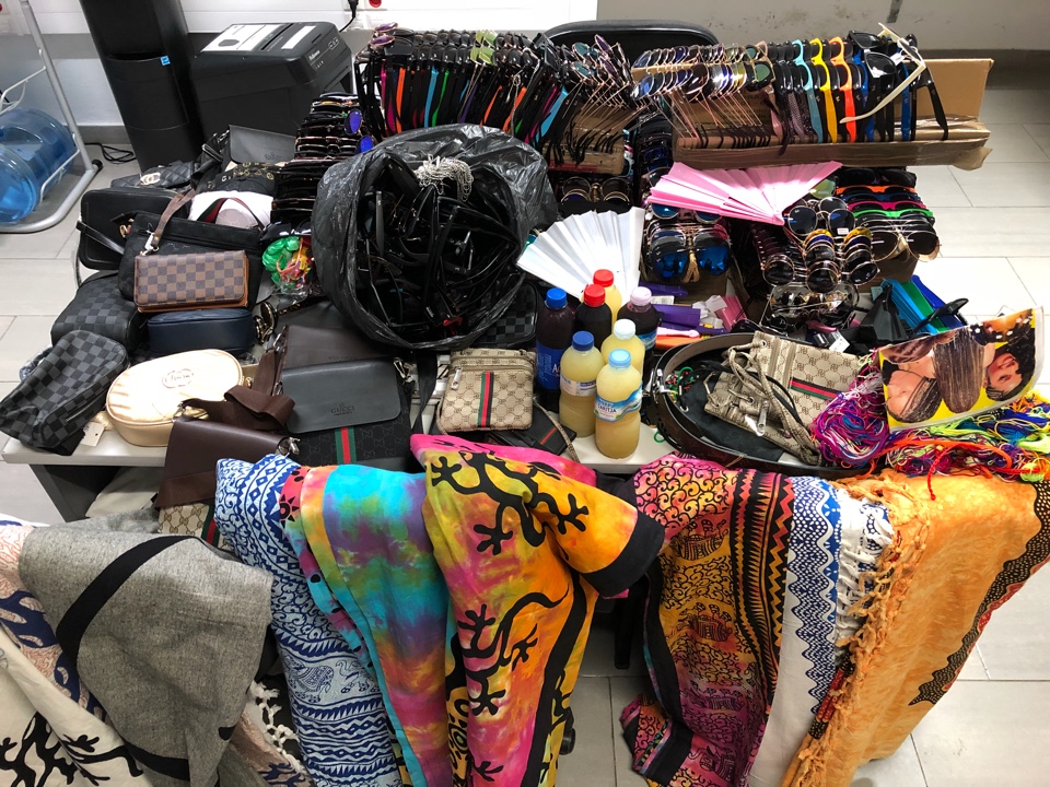 Asimismo, los agentes se incautaron de 100 kilos de hielo picado, 30 litros de licor de alta graduación, 6 kilos de fruta fresca, 60 bocadillos, 100 vasos de plástico, 118 vestidos y 25 gafas de sol, entre otros productos. Uno de los vendedores fue denunciado por tenencia de sustancias estupefacientes.