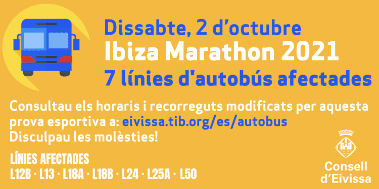 La celebració de la prova esportiva Ibiza Marathon 2021, prevista per aquest dissabte 2 d’octubre entre les 15 i les 21.30 hores, afectarà un total de vuit línies d’autobús. En concret, les línies que modificaran el seu itinerari i horari habituals són les següents: