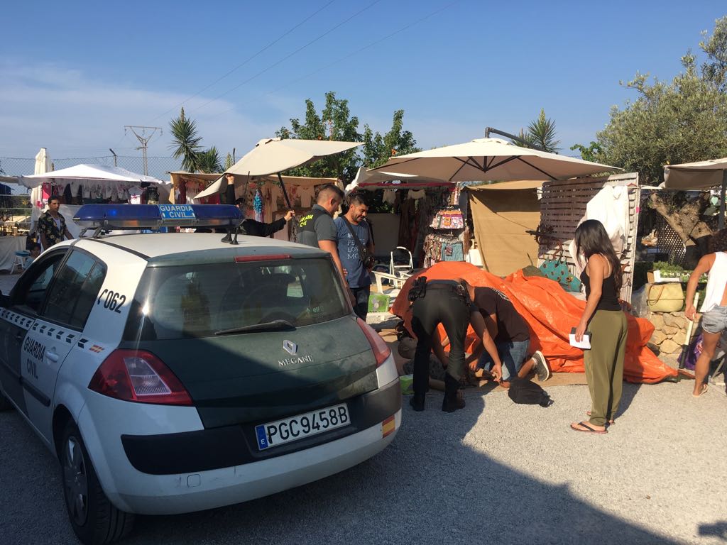 @Noudiari / Agents de la de la Policia Local de Santa Eulària des Riu i de la Guardia Civil han participat aquest matí en un simulacre d’actuació en cas d’emergència realitzat al mercadet de Las Dalias, a Sant Carles.