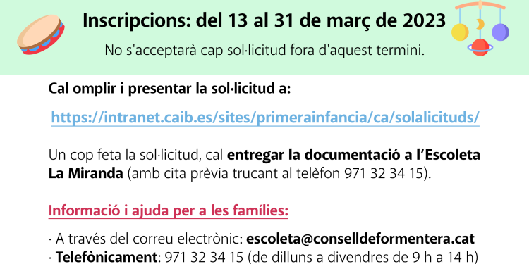 La presentació de les sol·licituds s’ha de fer telemàticament a la web del Govern balear: https://intranet.caib.es/sites/primerainfancia/ca/solalicituds/ i també es trobarà l’enllaç a la web del Consell de Formentera, a l’apartat de les escoletes. Un cop feta la sol·licitud, cal entregar la documentació a l’Escoleta La Miranda (amb cita prèvia trucant al telèfon 971 32 34 15). Les famílies poden demanar informació al correu electrònic: escoleta@conselldeformentera.cat o telefònicament: 971 323 415 (de 9.00 a 14.00h).