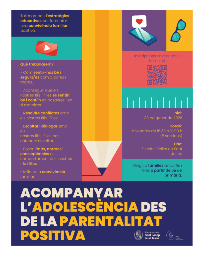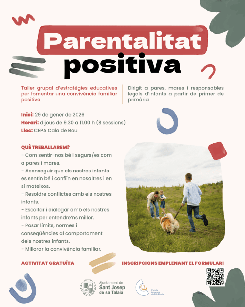 El Ayuntamiento de Sant Josep impulsa una nueva edición de los talleres de parentalidad positiva, dirigidos a familias con niños a partir de 6 años y adolescentes, «con el objetivo de reforzar las competencias emocionales, educativas y relacionales de los padres, madres y personas cuidadoras», informan desde el Consistorio.