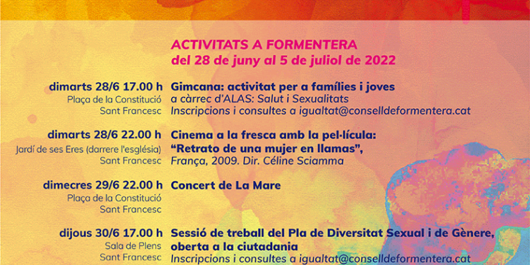Les activitats començaran el mateix dia 28 de juny a les 17 hores a la plaça de Sant Francesc. Amb una gimcana a càrrec de ALAS. Les inscripcions i consultes es poden realitzar a igualtat@conselldeformentera.cat.