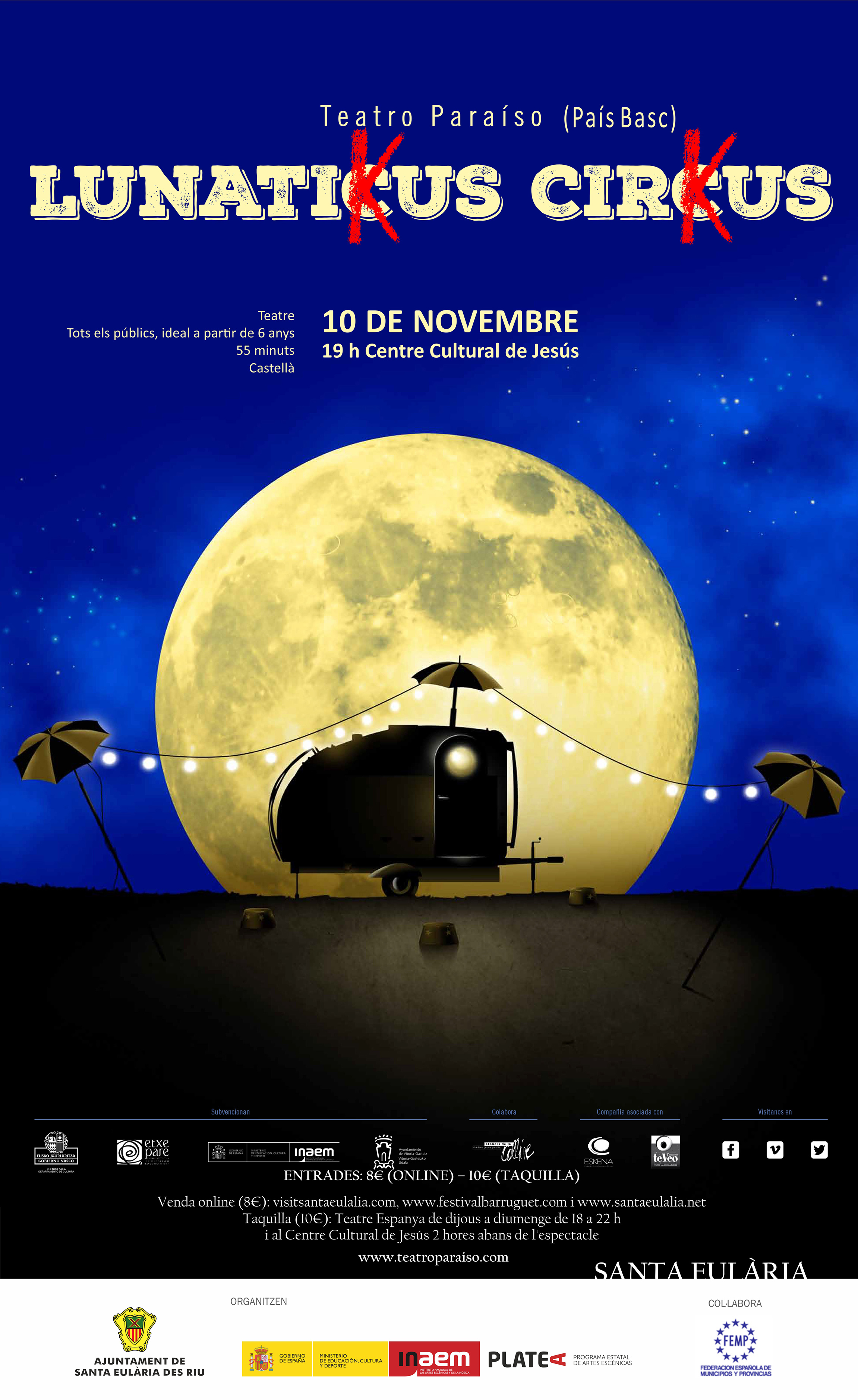 @Noudiari / El departament de Cultura de l’Ajuntament de Santa Eulària des Riu continua amb la seva programació d’Arts Escèniques de gran qualitat per a aquest mes de novembre. Si el passat dia 1 arribava a l’escenari del Palau de Congressos la ‘comèdia a capel·la’ amb The Primitals, aquest dissabte l’acció es trasllada al Centre Cultural de Jesús (CCdJ), que acollirà a partir de les 19.00 hores ‘Lunatikus Cirkus’, de Teatro Paraíso.