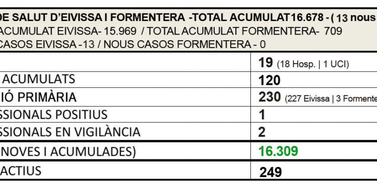 El Área de Salud de Ibiza y Formentera ha confirmado 13 nuevos contagios de covid en las últimas 24 horas, todos en Ibiza, en una jornada en la que los médicos han dado, asimismo, 13 altas. De esta manera, el número de activos se mantiene sin cambios, con 249 casos, todos correspondientes a Ibiza salvo tres que corresponden a la isla de Formentera.