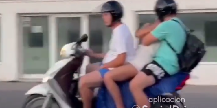 Esta vez se puede ver a tres personas subidas a una moto en marcha. Además, la persona que va en medio está casi recostada sobre el vehículo en una postura nada segura.