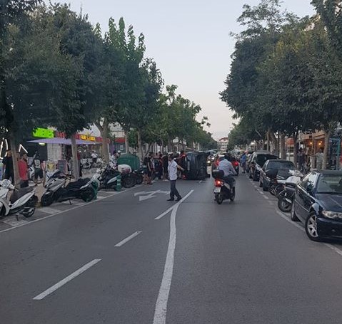 @Noudiari / Un coche vuelca el la Avenida Pere Matutes Noguera provocando grandes retenciones en esta vía de doble sentido y muy transitada. Especialmente afectados se han visto los autobuses de línea y autocares de hoteles que no podían pasar.