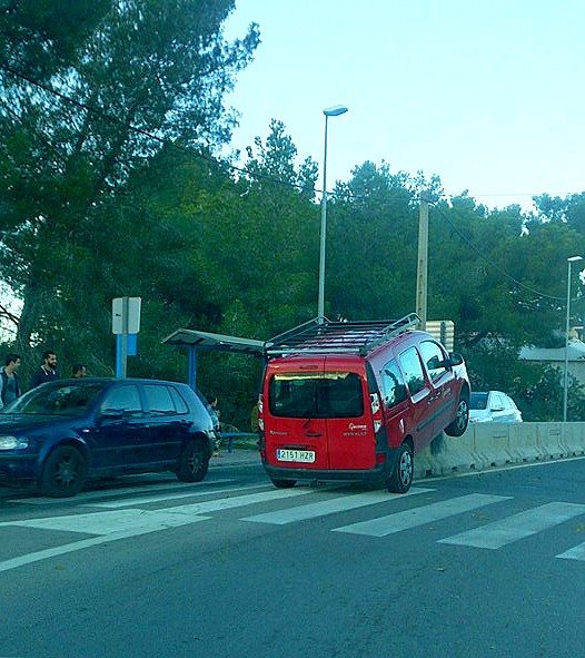 @Noudiari / Una pequeña furgoneta se ha subido a la barrera de cemento de la mediana de la carretera de entrada a Sant Antoni desde Sant Josep tras un pequeño y aparatoso accidente en el que no se han registrado heridos. La parte delantera del vehículo, de forma sorprendente, no ha sufrido daños importantes.