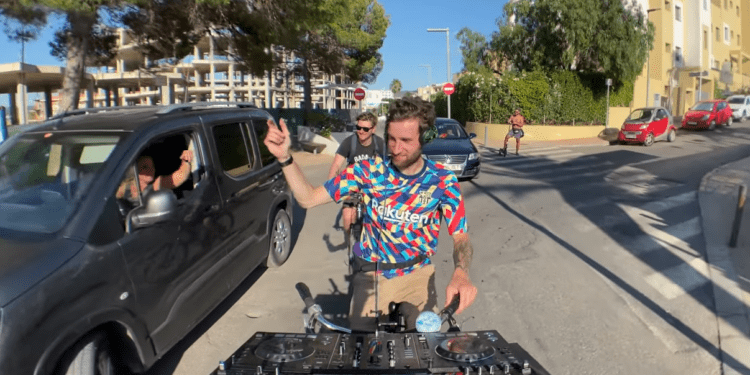 Con los clubes cerrados y algunos bares del West End con la persiana bajada, el dj recorre las principales calles del municipio desde del Passeig de Ponent al Passeig de la Mar, para regocijo de los turistas británicos con los que se topa.