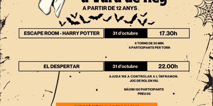 L’escape room de Harry Potter oferirà sis torns on podran participar grups de sis jóvens entre 12 i 18 anys. La inscripció prèvia es pot fer al Centre de Creació Jove C19 fins avui, 30 d’octubre, a les 20.30h. Els torns seran de 17:45 a 18:15 hores, de 18:30 a 19hores, de 19:15 a 19:45 hores, de 20:00 a 20:30 hores, de 20:45 a 21:15 hores i de 21:30 a 22 hores.