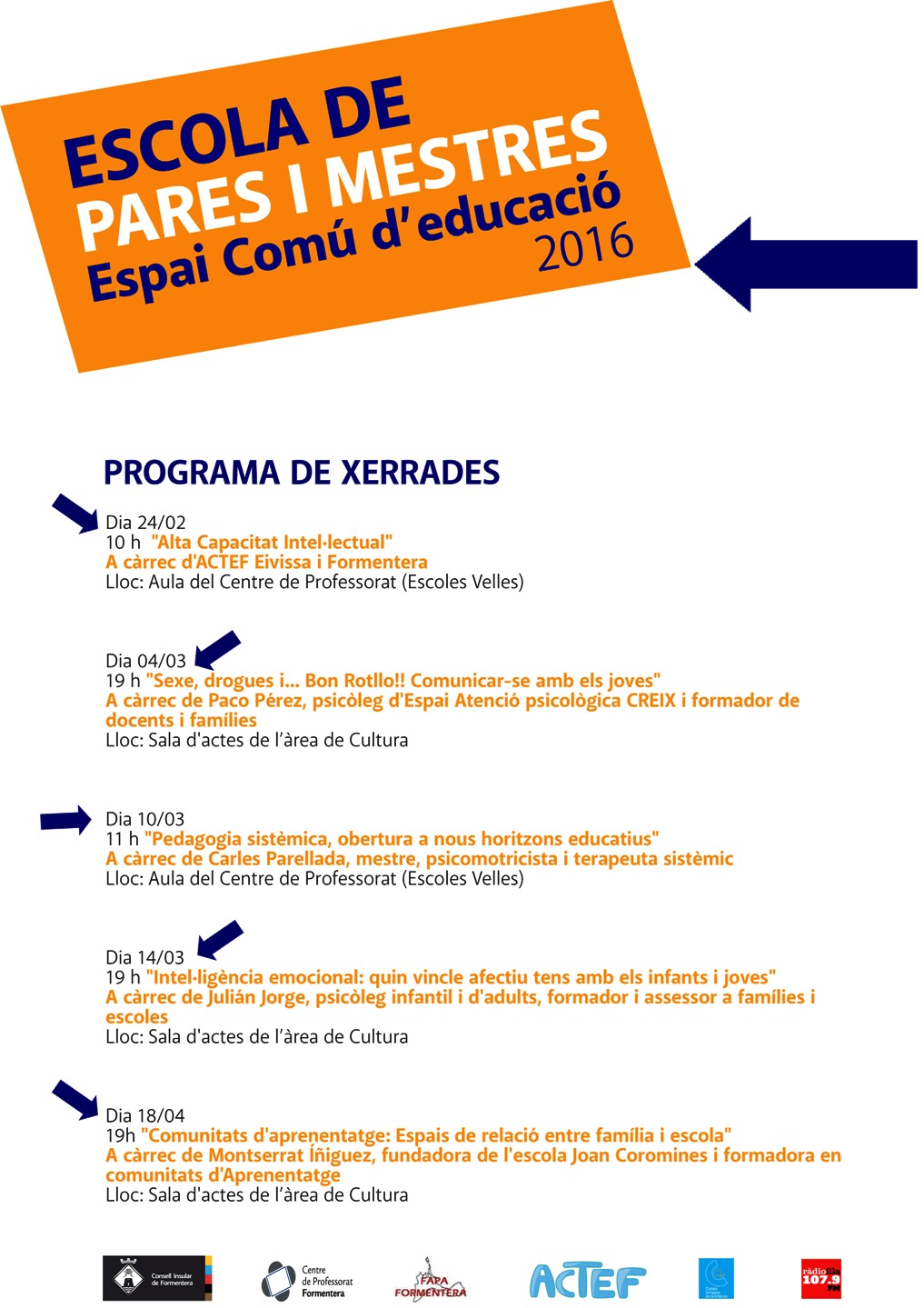 Las charlas son que se impartirán son: ‘Alta Capacidad Intelectual’ (ACTEF Eivissa i Formentera), el 24 de febrero; ‘Sexo, drogas i …Buen Rollo! Comunicarse con los hijos e hijas’ (Paco Pérez), el 4 de marzo; ‘Pedagogía sistémica, apertura a nuevos horizontes educativos’ (Carles Parellada), el 10 de marzo; ‘Inteligencia emocional: qué vínculos afectivos tienes con tus hijos» (Julián Jorge), el 14 de marzo; y ‘Comunidades de aprendizaje: Espacios de relación entre familia y escuela’ (Montserrat Íñiguez), el 18 de abril. En paralelo a estas charlas el CEP organiza un seminario con los mismos ponentes para los docentes.