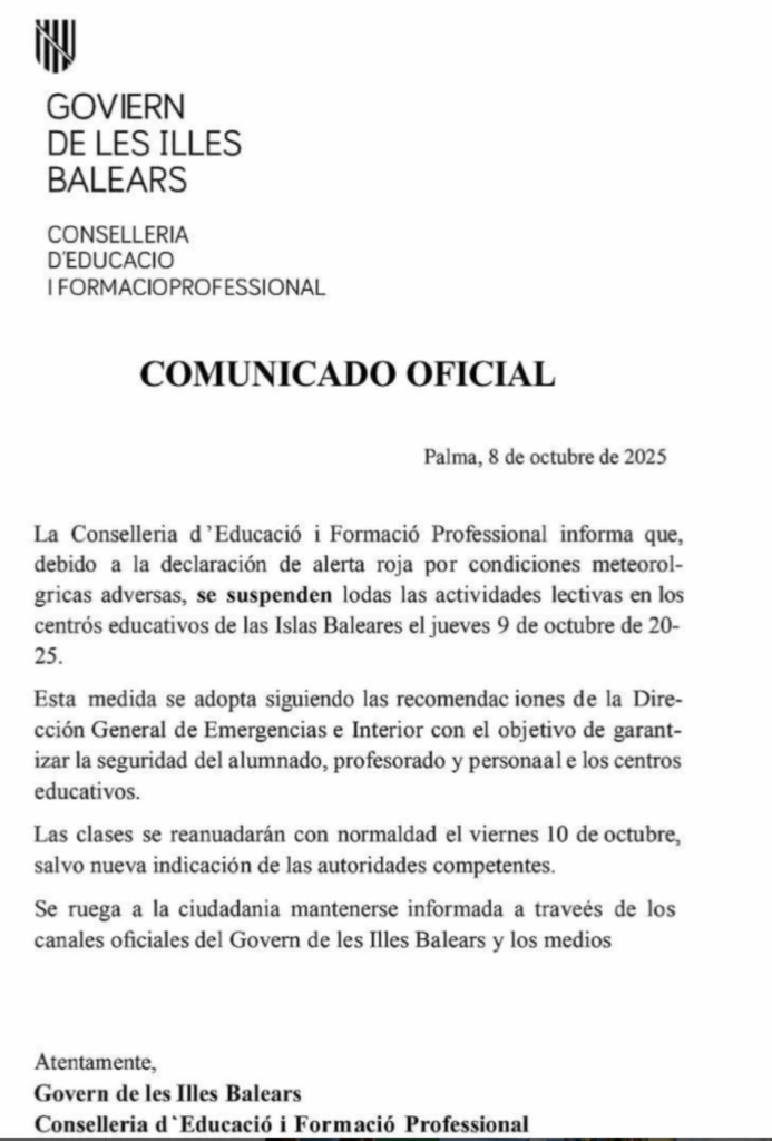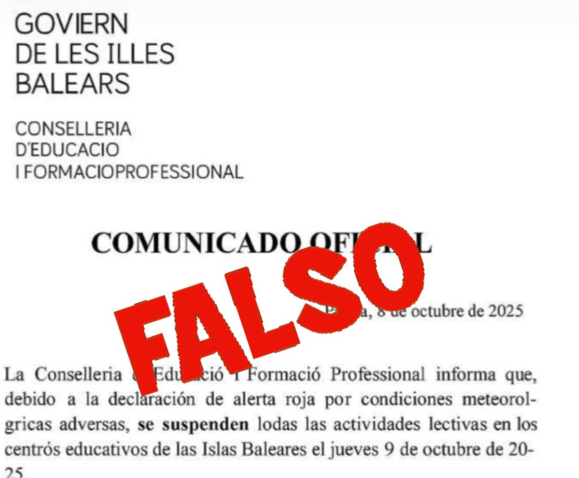 Un falso comunicado, difundido a través de redes sociales, afirma que la Conselleria d’Educació i Formació Professional ha suspendido las actividades lectivas en todos los centros educativos de les Illes Balears hoy jueves 9 de octubre debido a una alerta roja por condiciones meteorológicas adversas. Esta alerta no ha sido declarada ni ayer ni tampoco hoy en lo que llevamos de día (podría declararse en caso de empeoramiento de las previsiones pero esto no ha sucedido).