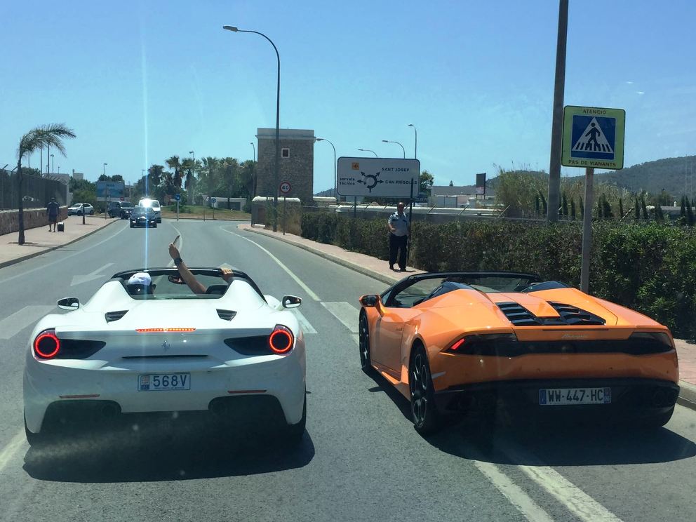@Noudiari / No hay nada como tener un coche de alta gama para creerse el amo de la carretera. Eso es lo que debieron pensar los conductores de un Ferrari blanco y un Lamborghini naranja, que no dudaron en pararse en mitad de la carretera al aeropuerto de Ibiza para hacerse un ‘selfie’.