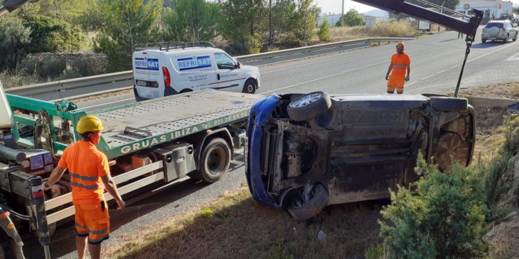 El conductor de un vehículo de alquiler ha golpeado a otro coche que circulaba por el mismo carril en la carretera Ibiza – Sant Josep, a la altura del Bar Can Jordi, provocando que volcara sobre el arcén. El conductor ha sufrido heridas de diversa consideración como consecuencia del impacto y ha tenido que ser trasladado por una ambulancia a un centro hospitalario para ser atendido. Una dotación de la Guardia Civil se ha desplazado hasta el lugar del siniestro para recabar información sobre lo sucedido y para regular el tráfico mientras tres equipos de auxilio en carretera de Grúas Ibiza se han ocupado de retirar de la vía a los dos vehículos.