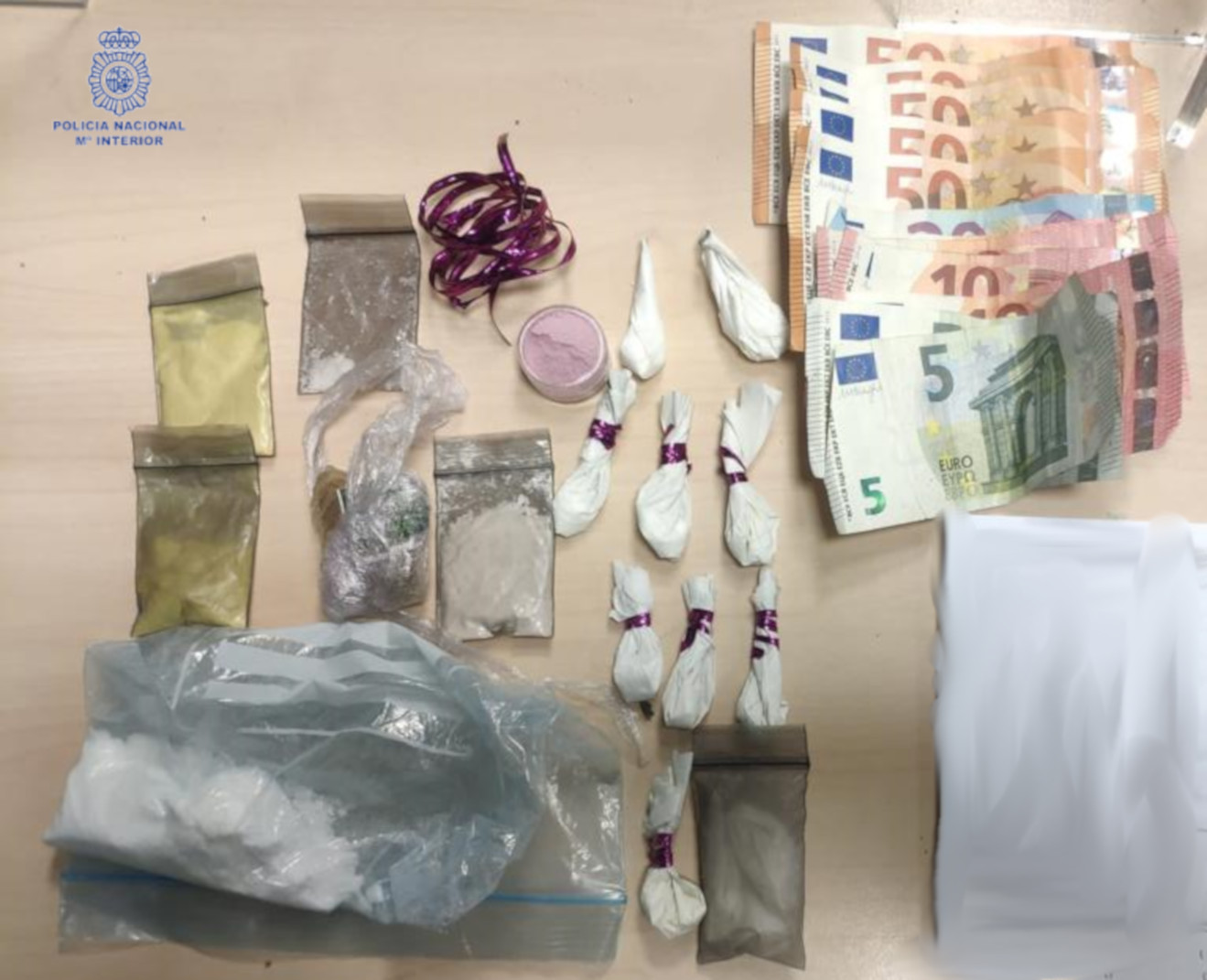 En el registro del vehículo hallaron 52,1 gramos de cocaína, 11,8 gramos de éxtasis, 3,52 gramos de ketamina, 7,9 gramos de cocaína rosa o Tusibi, 19,38 gramos de Hachís, 4 pastillas amarillas de éxtasis y 320 euros en efectivo.