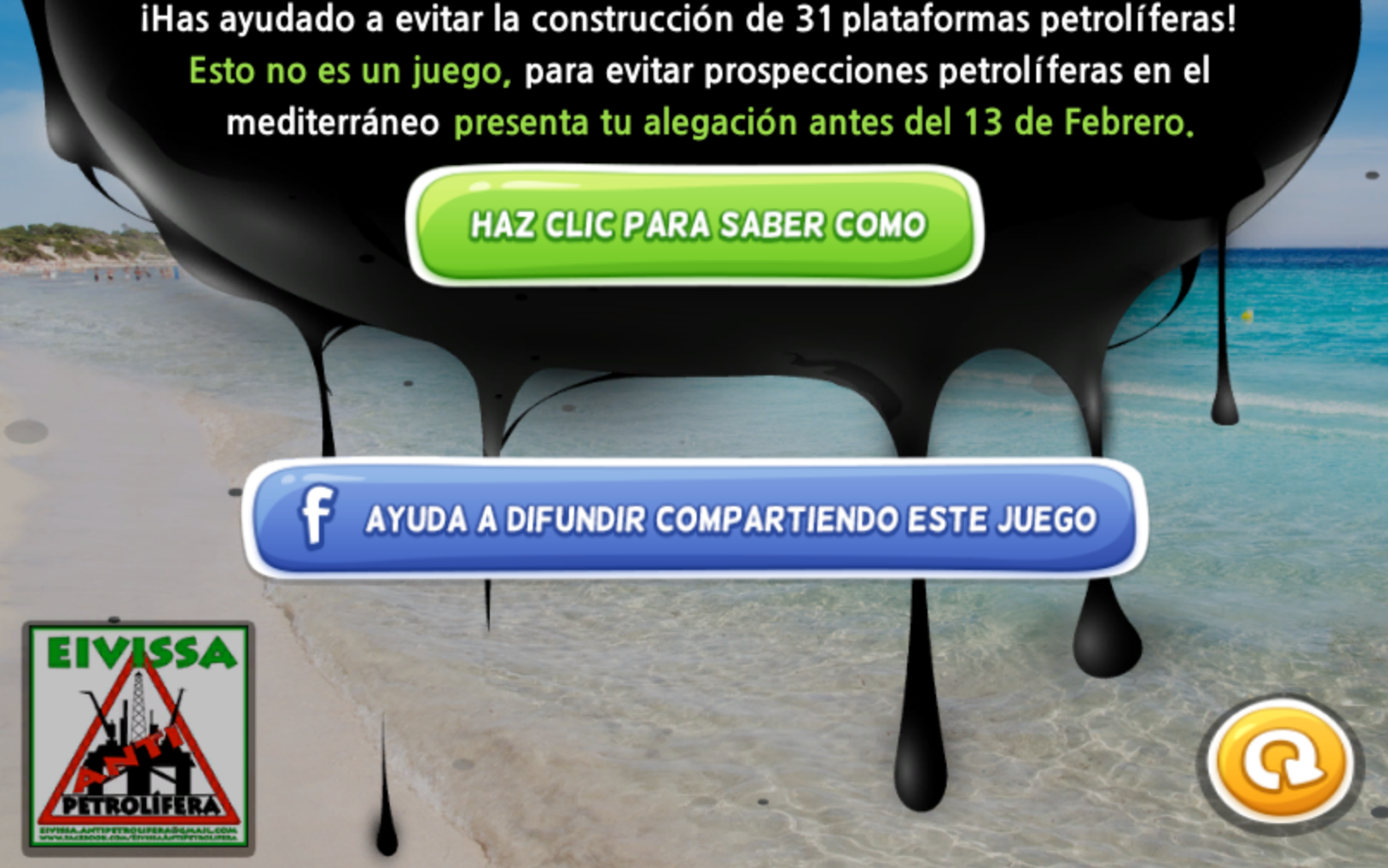 @Noudiari/ La empresa ibicenca de software VirtualMind ha desarrollado un juego para Facebook en el que quienes participan pueden destruir plataformas petrolíferas que surgen de forma espontánea rodeando a Eivissa. Tras instalarse un plugin, los jugadores tienen 30 segundos para eliminar el máximo de plataformas petrolíferas posibles y al finalizar, junto al resultado aparece un mensaje concienciador: “Esto no es un juego. Para evitar las prospecciones petrolíferas en el Mediterráneo presenta tu alegación antes del 13 de febrero”.