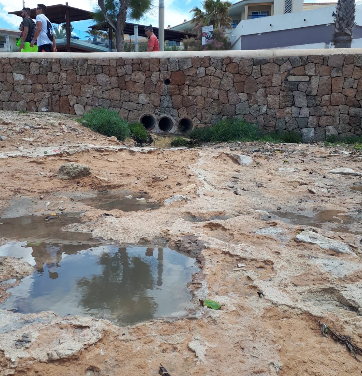 @Noudiari / Un nuevo vertido de aguas fecales en Caló des Moro, Sant Antoni, ha obligado a izar la bandera roja en la zona de baño este domingo después de que el líquido que salía de una alcantarilla llegara al mar.
