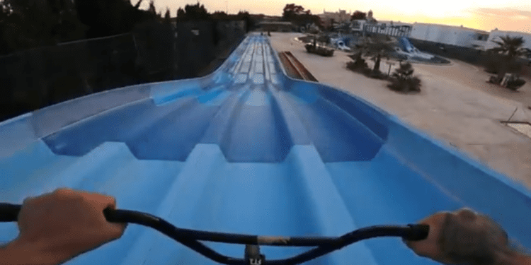 Ryan Taylor, un conocido youtuber e influencer de la esfera BMX, parece haberse especializado en lanzarse con su bici sin frenos por los toboganes de parques acuáticos de todas partes.