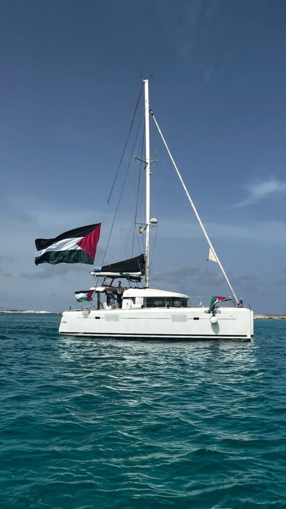 El catamarán con la bandera palestina. / The Surge La Marea Ibiza.