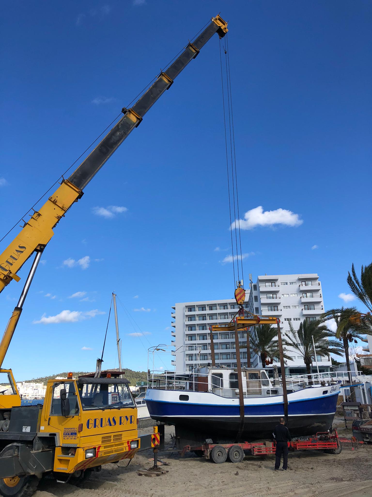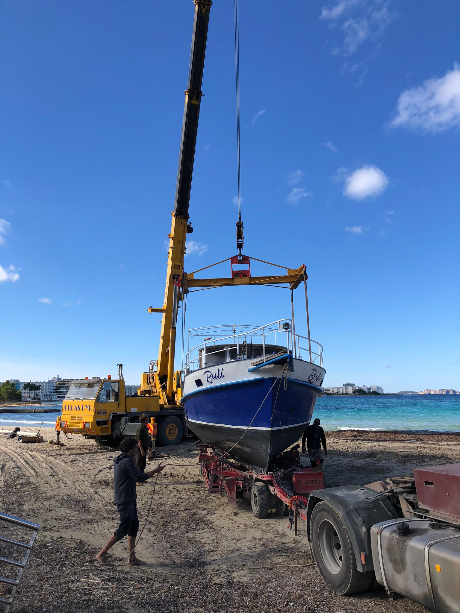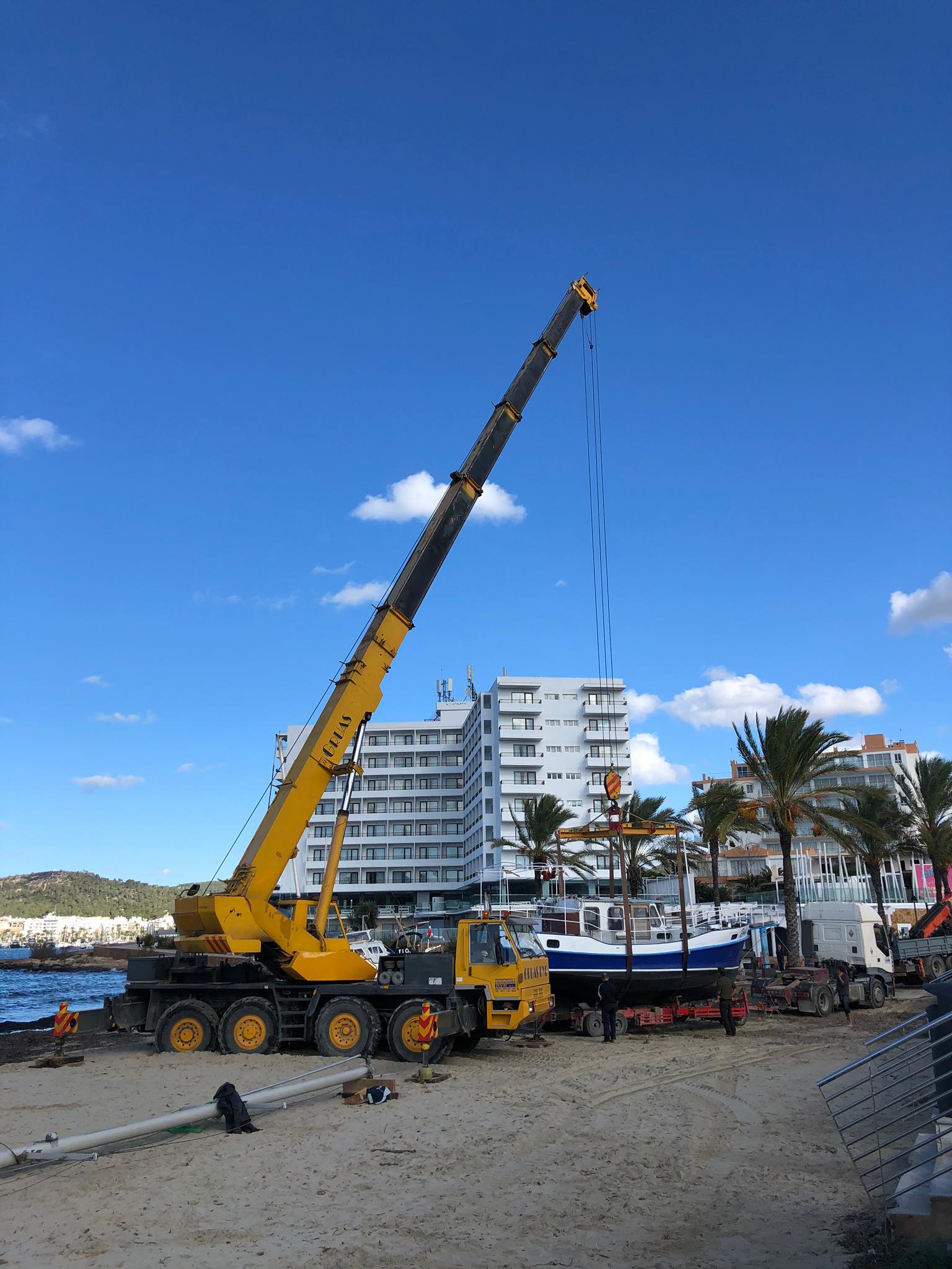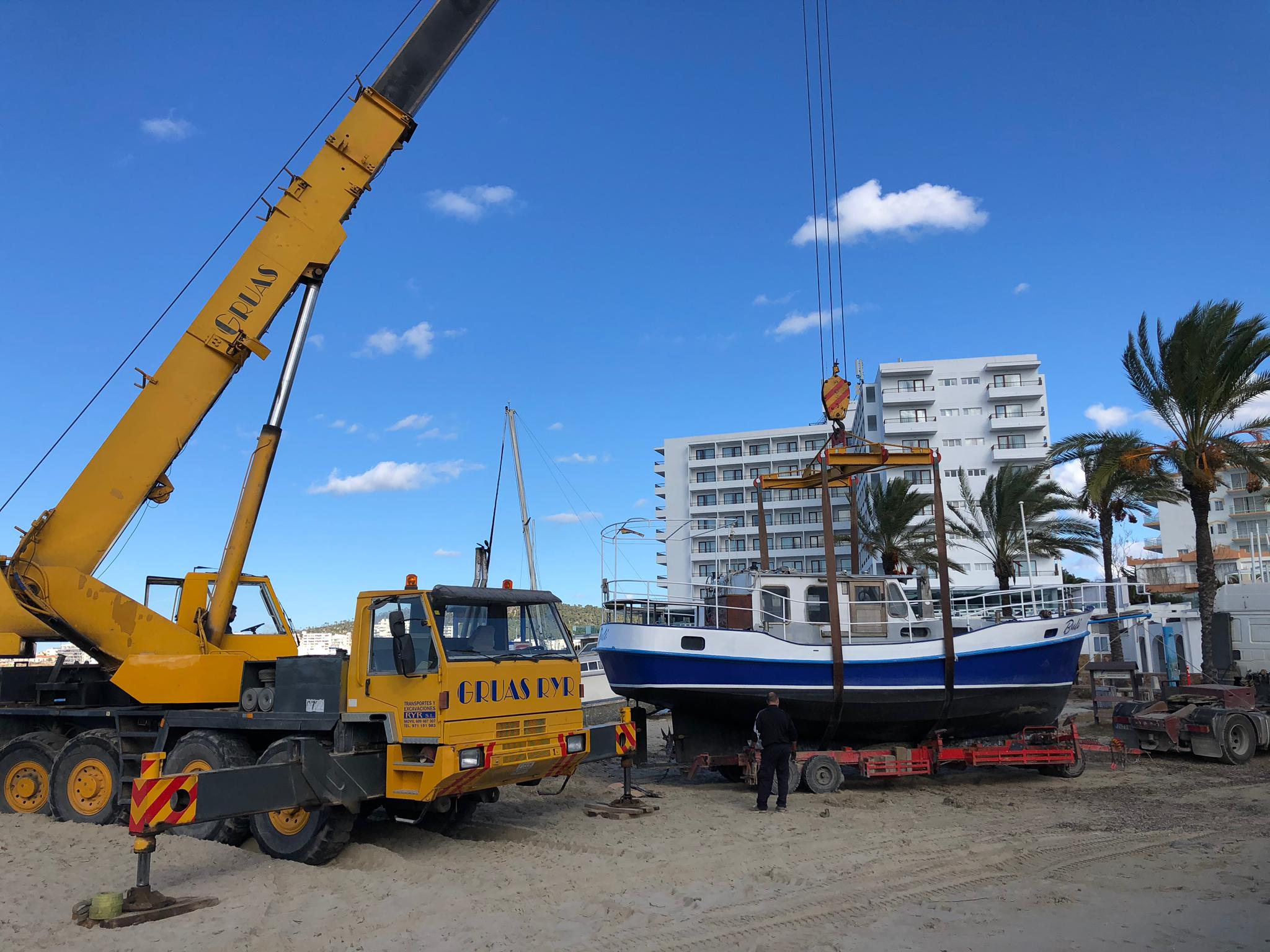 Una enorme grúa retira uno de los barcos que embarrancó por el temporal en Sant Antoni