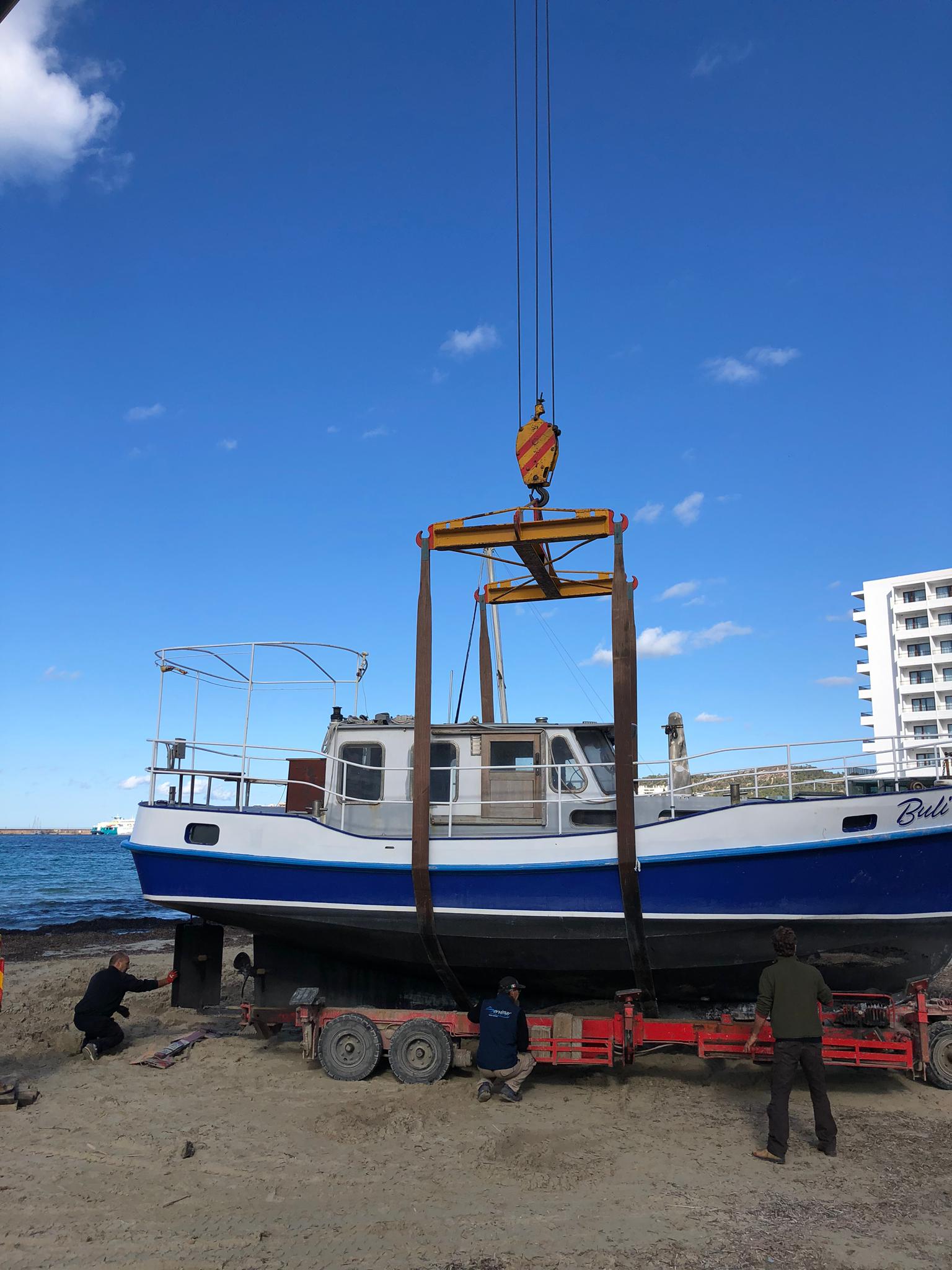 Hoy,  diez días después, una grúa de grandes dimensiones ha retirado uno de los barcos de la playa, el Buli. En la playa hay otra embarcación, de tipo catamarán.
