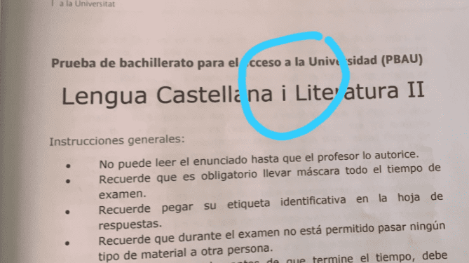 Las redes sociales arden contra el sistema educativo de Baleares, después de que los alumnos que ayer se examinaban de ‘Lengua Castellana y Literatura II’ en las pruebas de acceso a la Universidad (PBAU), detectarán un gran error de ortografía en el enunciado del examen. Como se aprecia en la imagen, han sustituido la ‘y’ griega por la ‘i’ latina, como hubiera sido correcto si se tratara de un enunciado en catalán.