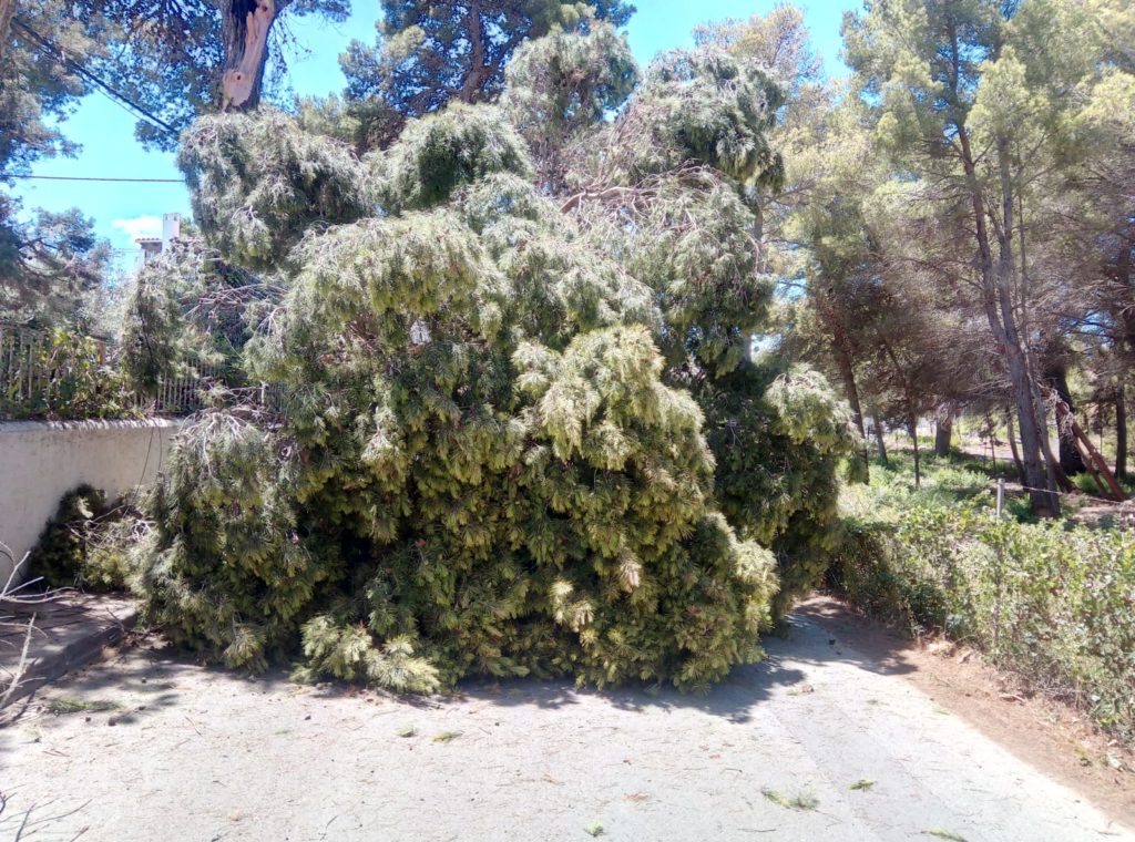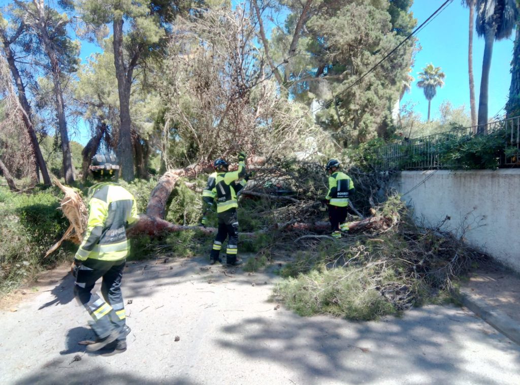 Una rama de árbol de grandes dimensiones ha caído este miércoles al mediodía sobre un coche en el que había dos personas. Ha ocurrido en s’Argamassa, Santa Eulària, aunque afortunadamente los dos ocupantes del turismo han resultado ilesos, según han confirmado los bomberos.