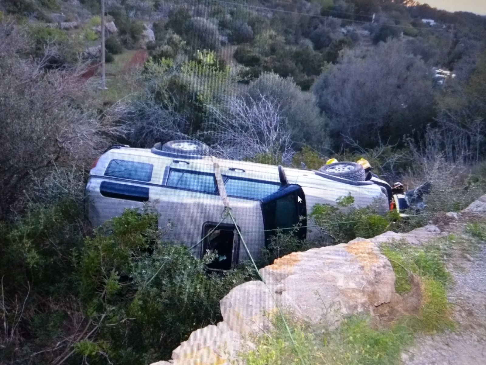 @Noudiari / Una niña de tres años y una mujer que conducía un Land Rover Discovery han resultado heridas de gravedad cuando el vehículo ha caído por un terraplén de unos cinco metros de altura en el camino de Cas Ripolls, que va paralelo a la carretera de Sant Joan a Sant Vicent de sa Cala.