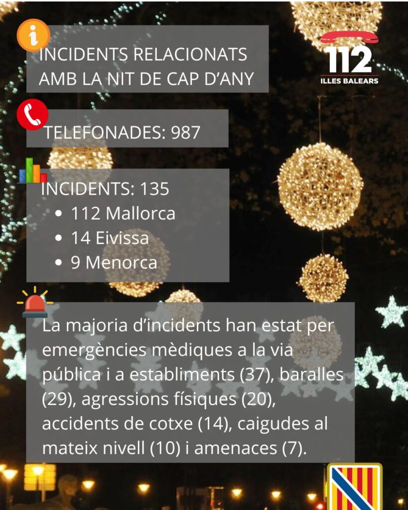 El centro de coordinación de Emergencias 112 atendió durante la pasada Nochevieja un total de 987 llamadas, que dieron lugar a la gestión de 135 incidentes relacionados con las celebraciones de Fin de Año, la mayoría de ellos registrados en Mallorca.