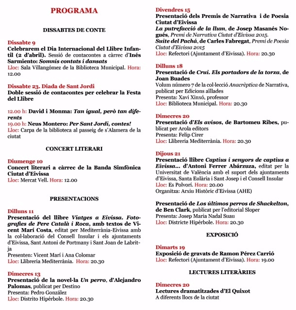 También se incluye dentro del programa la presentación de los premios de narrativa y de poesía Ciutat d’Eivissa, que se hará en la sala del refectorio del Ayuntamiento de Ibiza el viernes día 15 de abril a las 20:30 horas. Se presentarán las obras ganadoras ‘La putrefació de la llum’, de Josep Masanés Nogués, Premio de narrativa Ciutat de Ibiza 2015 y ‘Suite del Pachá’, de Carles Fabregat, Premio de Poesía Ciutat de Ibiza 2015.