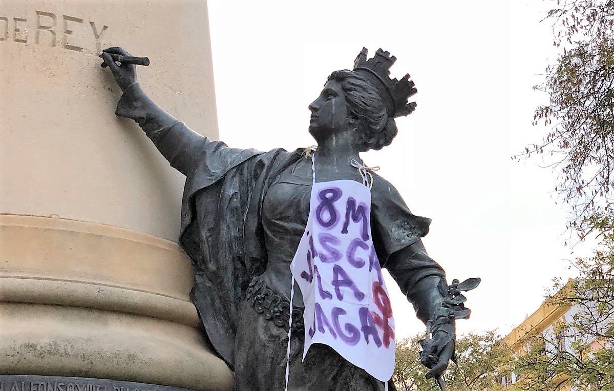 @Noudiari / Una de las estatuas del monumento al general Vara de Rey, en el paseo del mismo nombre, ha aparecido vestida con un delantal en apoyo a la huelga prevista para el 8 de marzo, Día Internacional de la Mujer.
