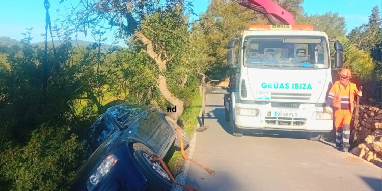 Un vehículo ha quedado volcado esta mañana en un accidente de tráfico ocurrido alrededor de las 7 de la mañana en la carretera que conecta Santa Eulalia con la carretera vieja del mismo municipio. Al parecer, el incidente involucró a un Audi A3 y un todoterreno, cuya errática trayectoria finalizó al chocar contra un muro de piedra y abalanzarse sobre el turismo.