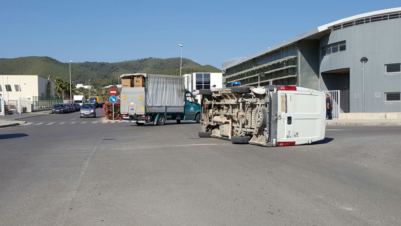 @Noudiari/Una furgoneta de carga ha volcado esta mañana tras chocar contra un turismo en el polígono industrial Montecristo, de Sant Antoni. En el accidente no hubo heridos, pesar de la aparatosa colisión, que dejó la furgoneta volcada sobre el asfalto tras el impacto.