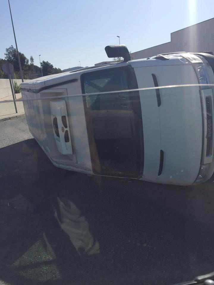 Imagen de la furgoneta volcada en la entrada del polígono Montecristo.