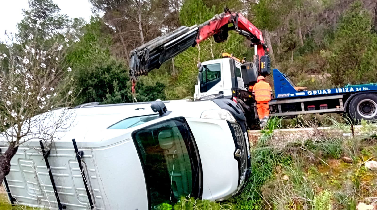 Un furgón Renault Mascott sufrió un accidente en la tarde de ayer en el camino de la cantera de Can Xumeu, en el municipio de Sant Josep, tras salirse de la vía y volcar sobre su costado derecho.