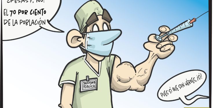 El humorista gráfico Untaltoni homenajea en su viñeta de este viernes a los sanitarios por el ‘músculo’ desarrollado a lo largo de toda la pandemia así como por haber conseguido vacunar en un tiempo récord al 70% de la población contra la covid-19, un hecho que debería representar, según los científicos, el principio del fin de esta larga pesadilla.