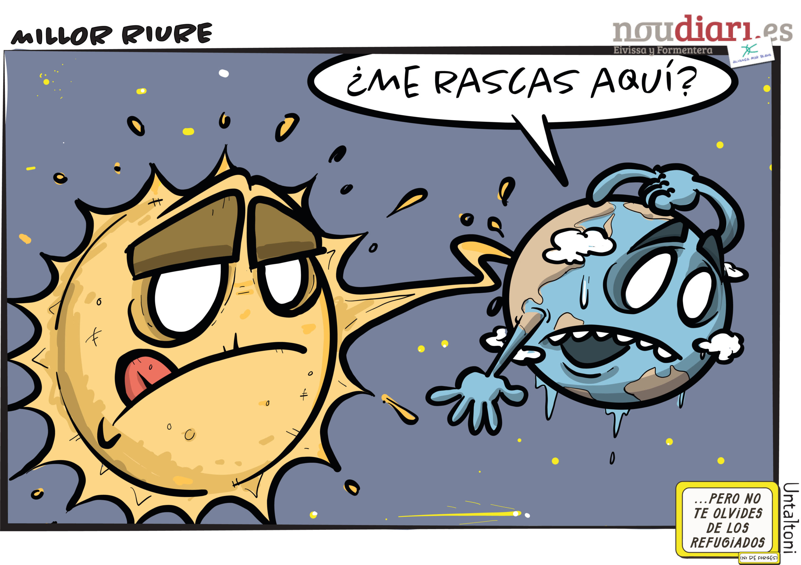 La tierra se derrite con el cambio climático y pide al sol un poco de ayuda contra ciertos ‘parásitos’ que contribuyen a ello, en esta nueva viñeta de la sección Millor Riure de Toni Untaltoni.