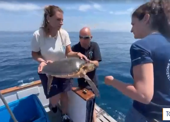 El patrón de un chárter rescata una tortuga en aguas de Ibiza enredada en un palangre ilegal